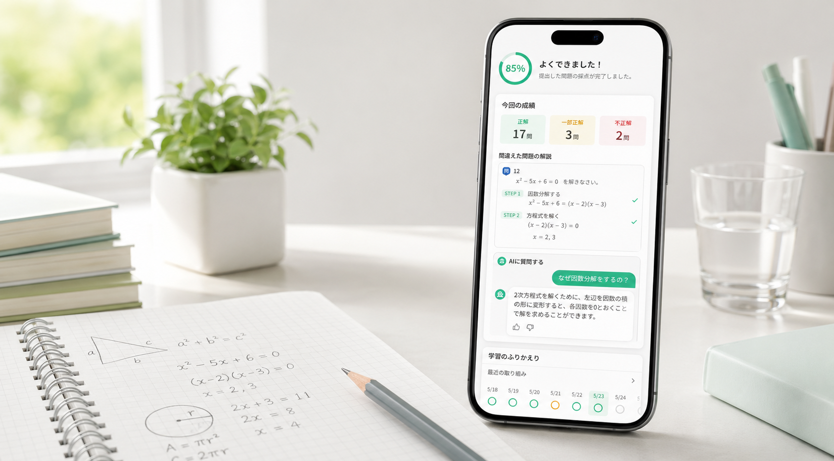 Studier は、画像提出による採点、解説、質問、履歴管理、通知までをつなげて、 迷わず続けやすい学習体験を整えるためのアプリです。